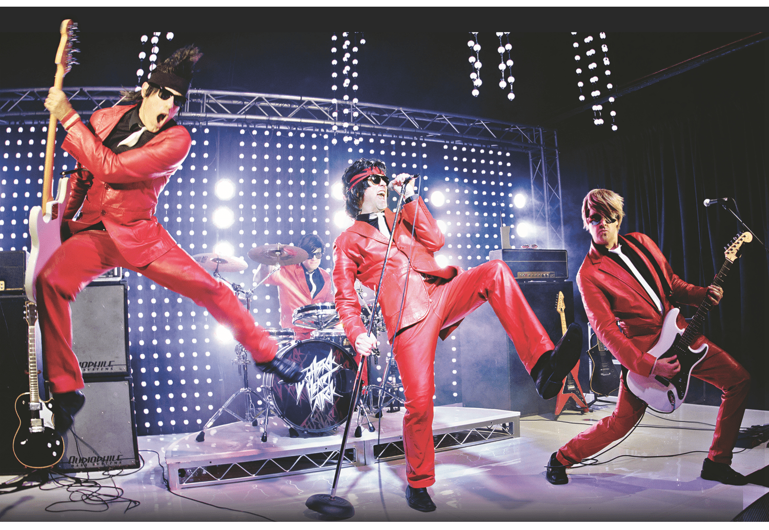 Four men wearing bright red suits with an 80s aesthetic performing energetically on stage.