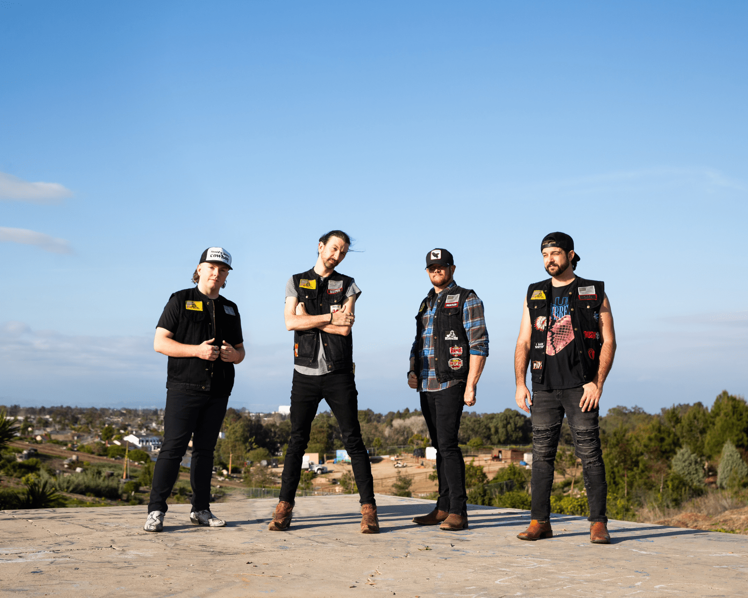 Four men stand on the roof of a building while facing the camera wearing black vests.